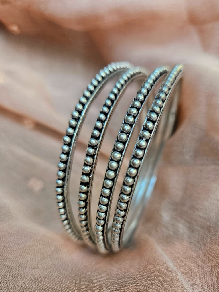 This is a sturdy pair of handcrafted 925 Sterling Silver bangles. They feature a beaded look which lends itself beautifully to all kind of ensembles. These silver stacking bangles can be used to mix and match with other silver bangles you may have or can just be worn by themselves. These are made to withstand everyday wear so no bending or getting heat up. These indian silver bangles are available online in 2 sizes.