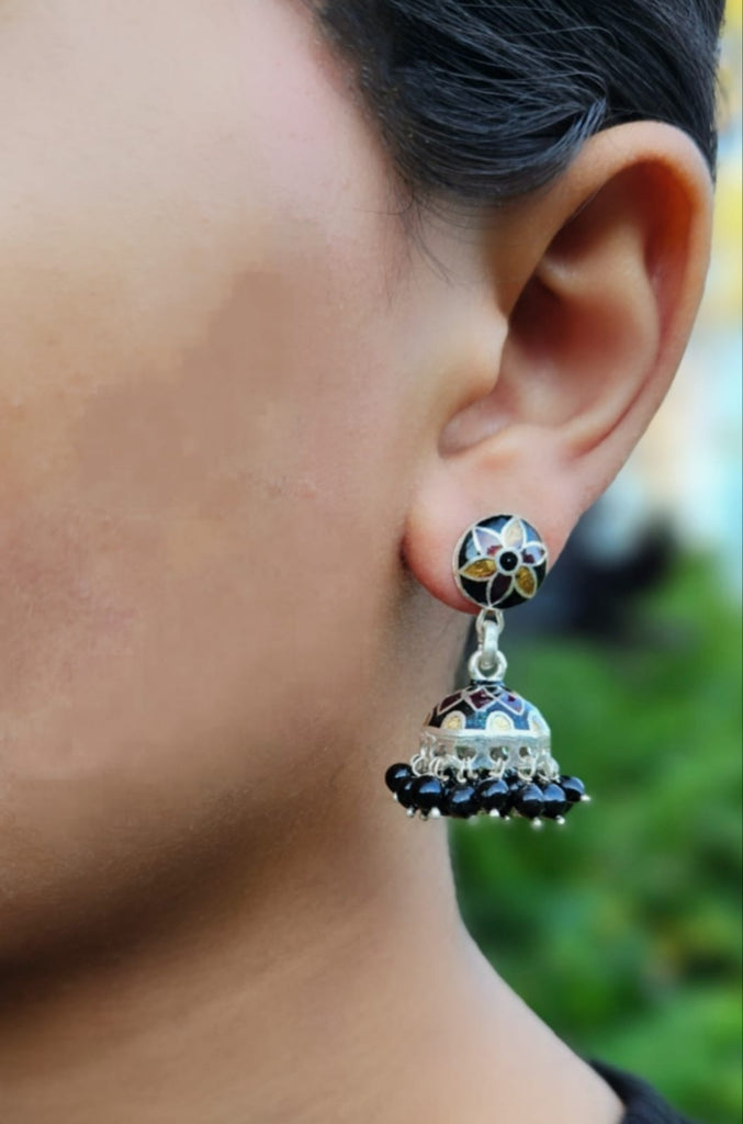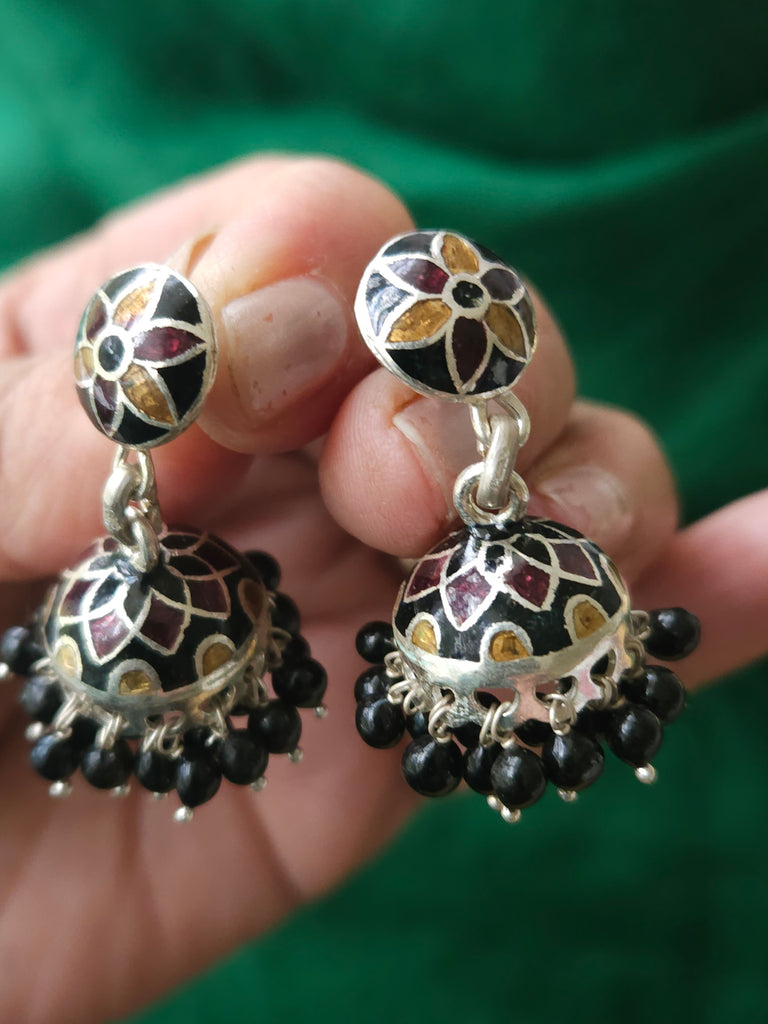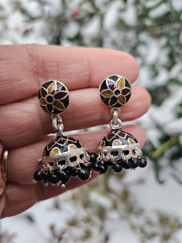 Silver Jhumka Earrings, 925 Sterling Silver small Jhumka with Enamel work