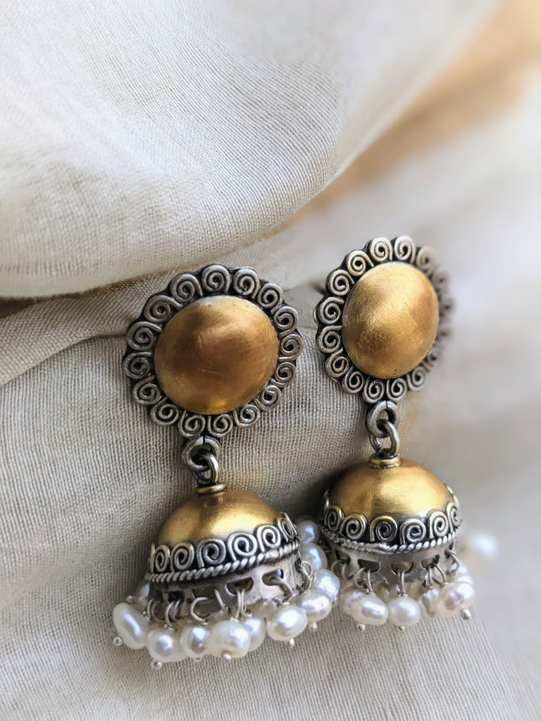Dual Tone Gold and Silver Jhumki with pearl, Silver Jhumka, Faded gold finish