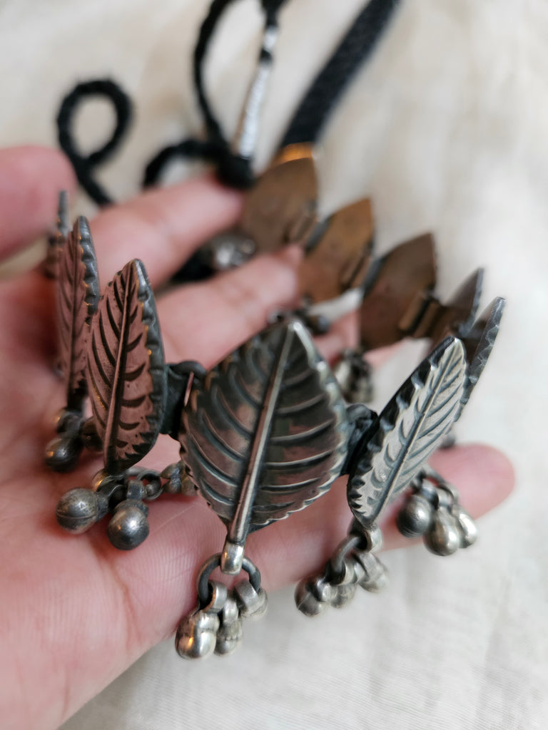 This is a artisan made pure Silver (92.5 Sterling ) boho indian oxidized finish necklace with leaf pattern. It has adjustable thread closure.
