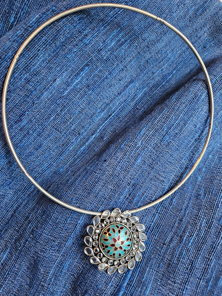 Sterling Silver hasli necklace with meenakari pendant and earring