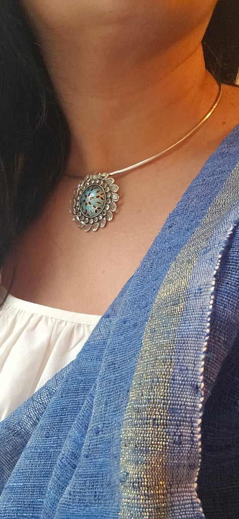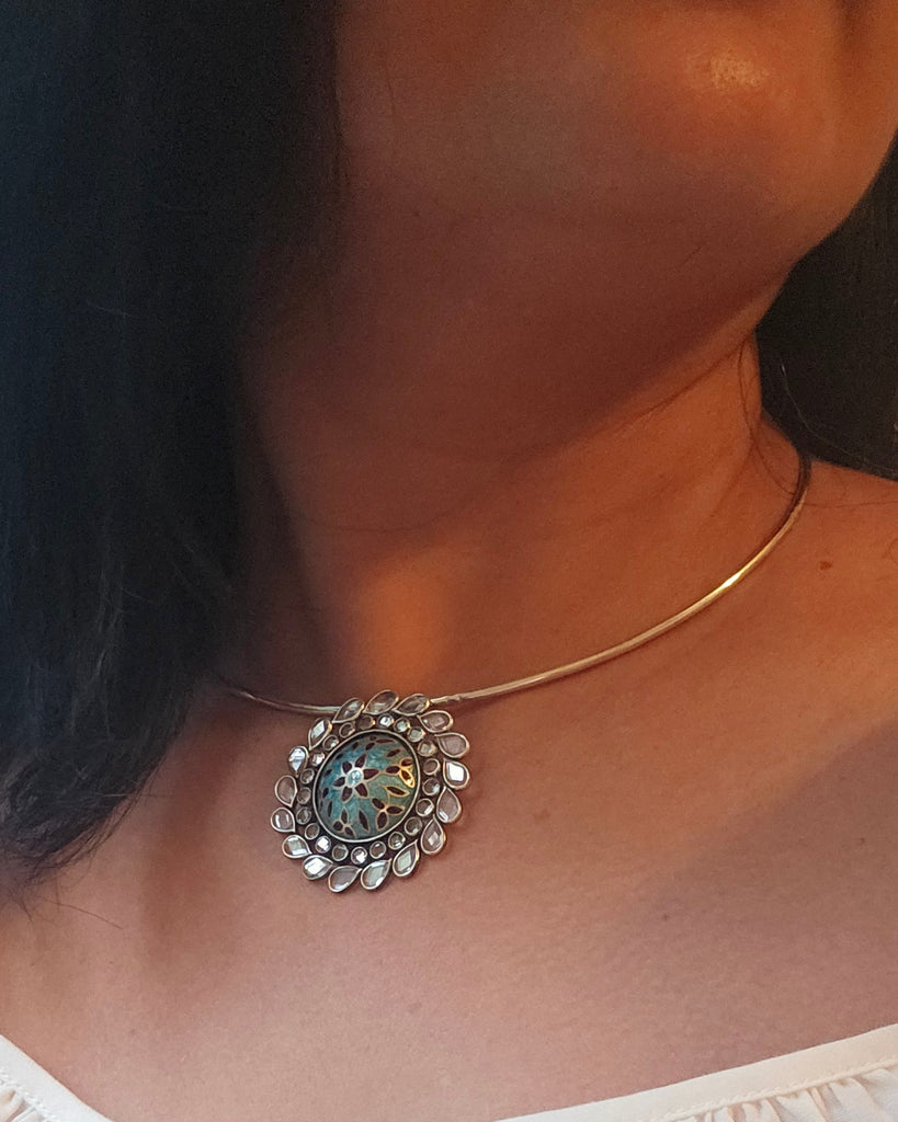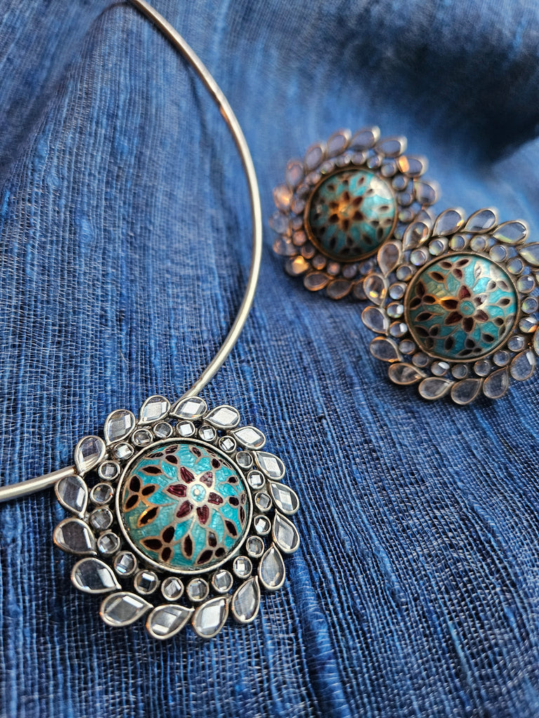 Handcrafted in 92.5 silver, these stud earrings and pendant in wire hasli feature traditional meenakari work in turquoise and black. The hand-painted floral motif is framed with kundan-style glass, catching the light beautifully against the silver base. Traditional in technique yet effortlessly chic, they carry a modern, classy edge — a one-of-a-kind piece that stands out with quiet elegance.