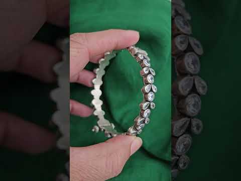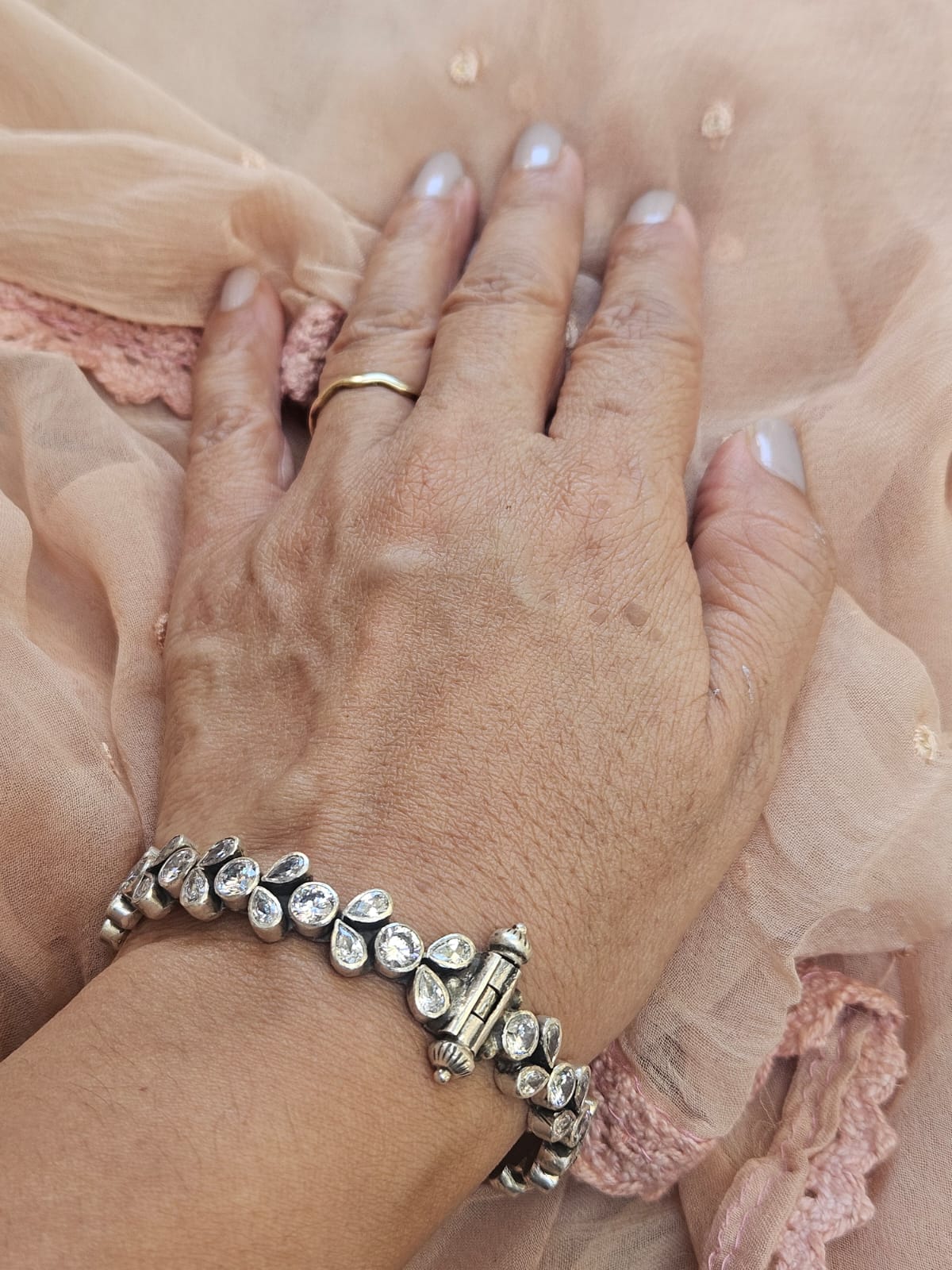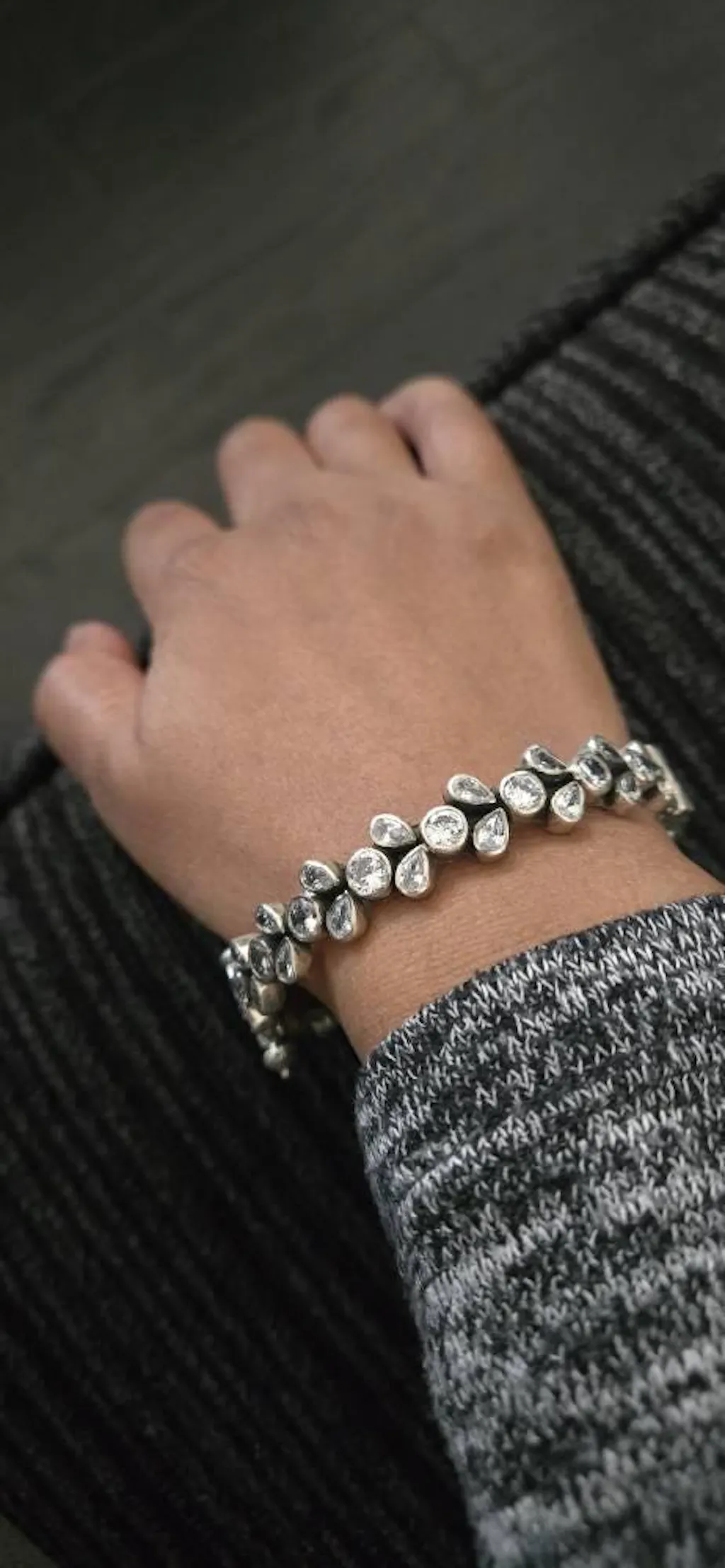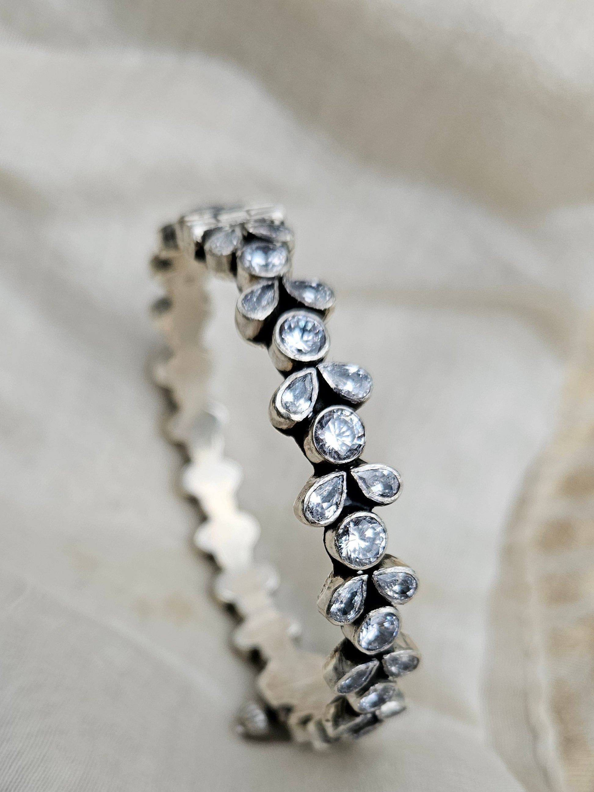 LEELA - 925 Sterling Silver Women Kada - Pure Silver Adjustable Indian Bangle with zirconia stones