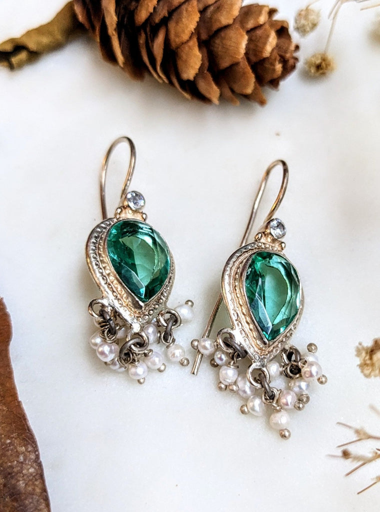 Absolutely stunning gemstone hook earring in 925 Sterling Silver with pearl bunch detail. Faceted Green onyx/Amethyst/Mother of Pearl is encased in a polished sterling silver frame, with dangling pearls creating movement and elegance with every step. Lightweight and easy to wear, perfect for daily elegance or special occasions.